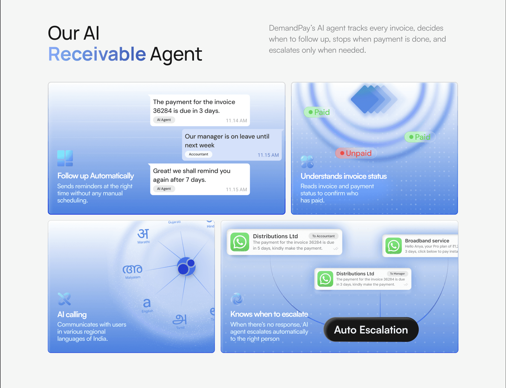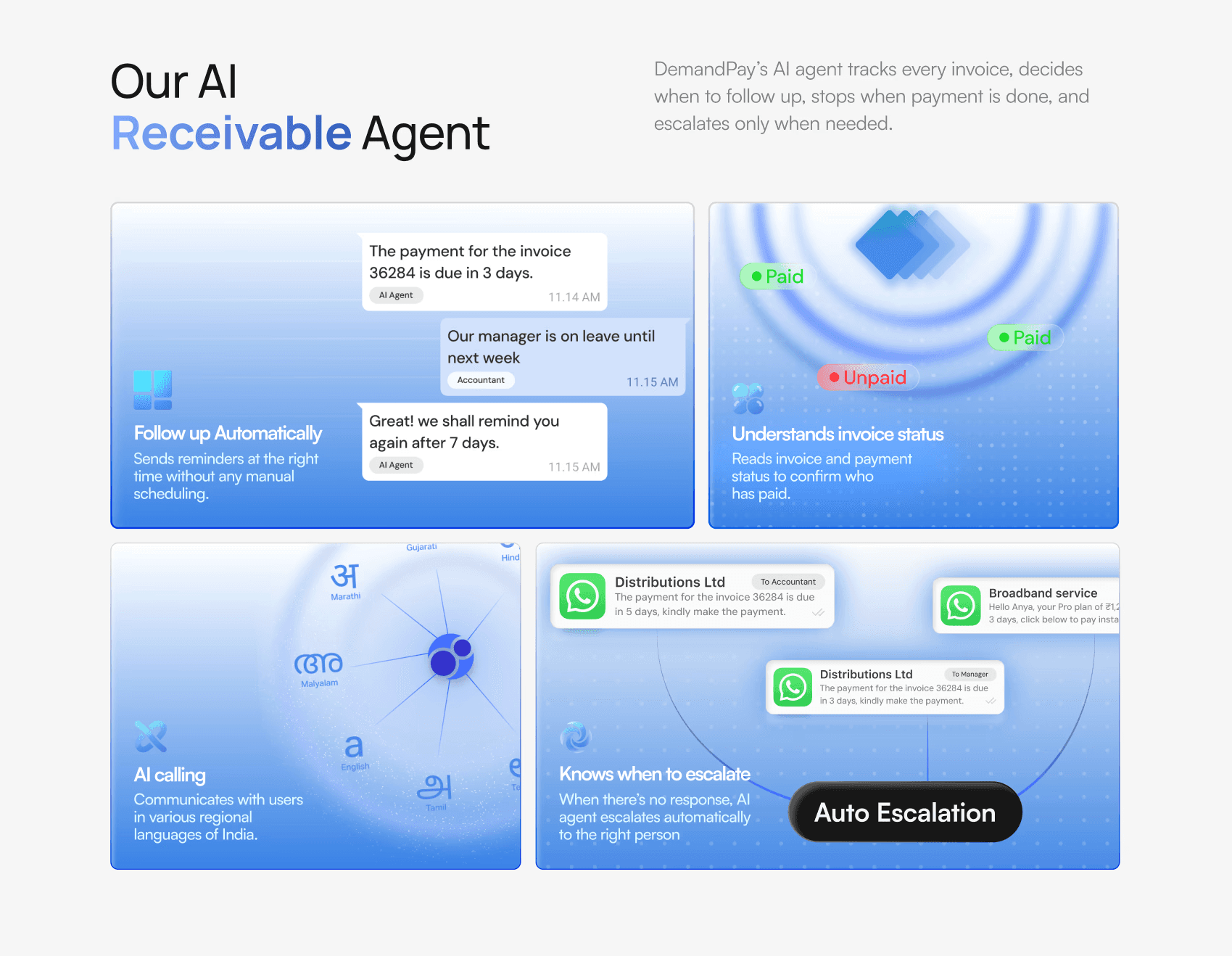 DemandPay is a subscription billing and payment recovery platform — think of how a cable TV company needs to remind thousands of customers to pay, renew, or change their plan. DemandPay automates that entire flow, sending payment reminders and direct payment links via WhatsApp, SMS, and email so businesses never have to chase customers manually.